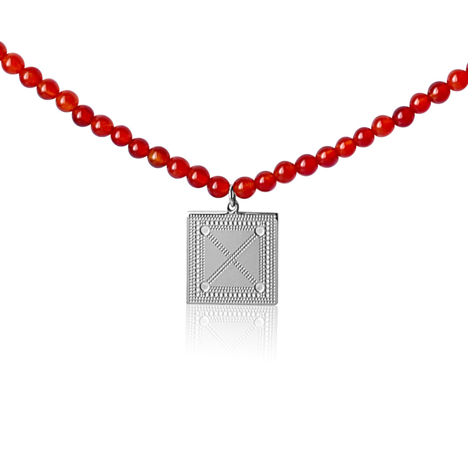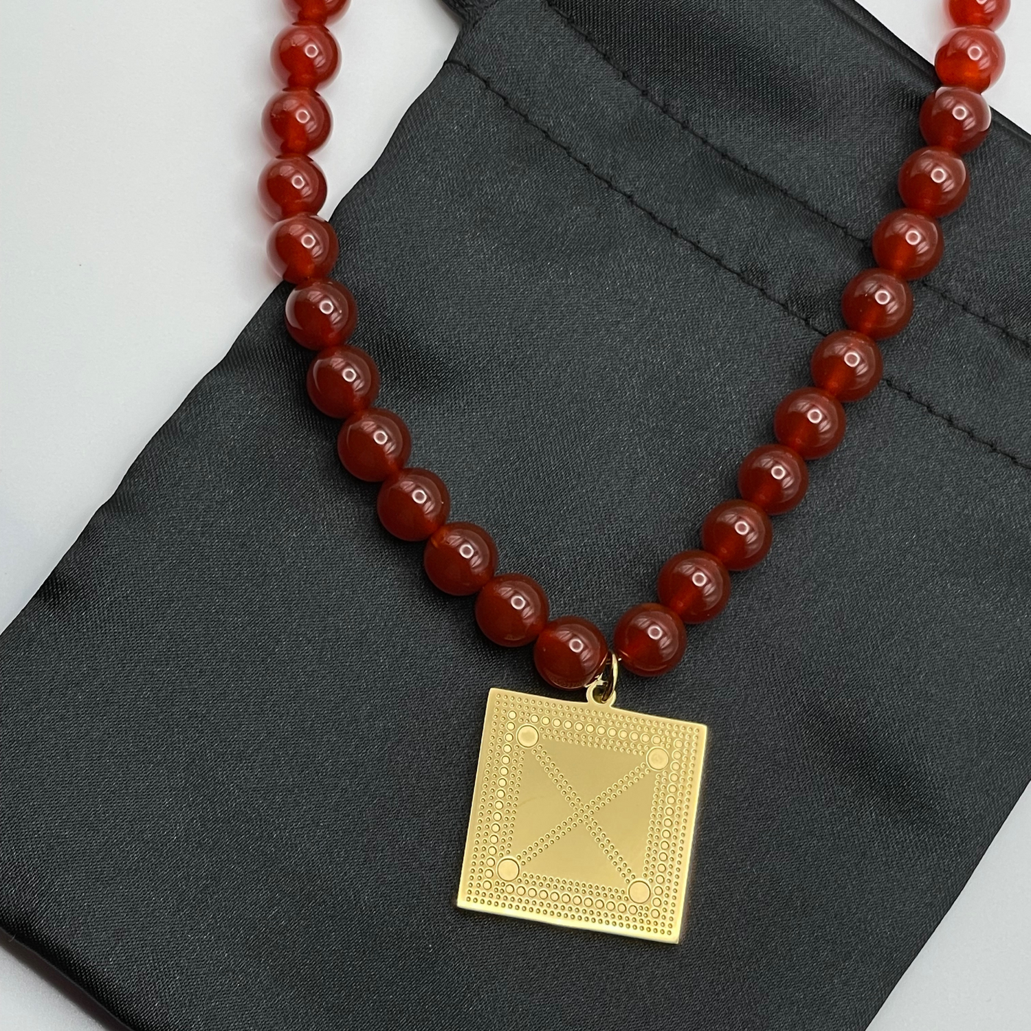WARSAN is inspired by a Somali beaded necklace. This beaded necklace consists of a square pendant with detailed engraving paired with 6mm agate beads. You can wear it on its own or pair it with your favorite dainty necklace.